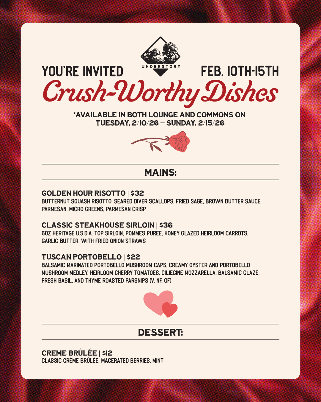 Celebrate an entire week of Valentine’s Day-themed delights. This menu is the perfect opportunity for lovers, friends, and everything in-between to connect around a menu curated specifically for Valentine’s Day.